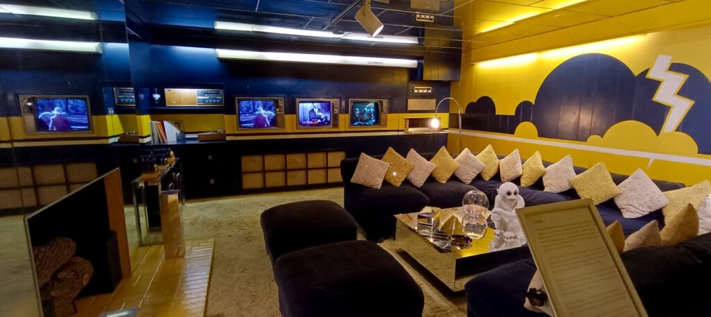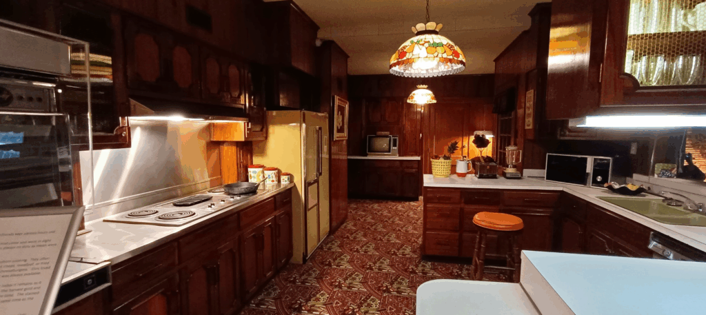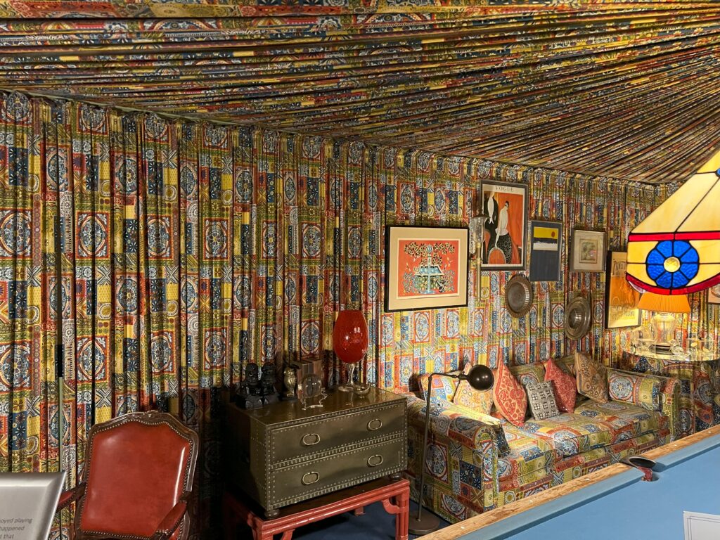 We join the slow progress of visitors snaking through the relatively small mansion. There’s a wide variety of Elvis’s decorative tastes on show. We get to see the kitchen complete with the latest 1970’s labour-saving gadgets, the snooker room adorned with beautifully designed fabric stretched across walls and ceiling, the jungle room – a Polynesian-themed room with bamboo furniture, a waterfall, and tropical plants, and the chill-out room where Elvis could watch four televisions at the same time.