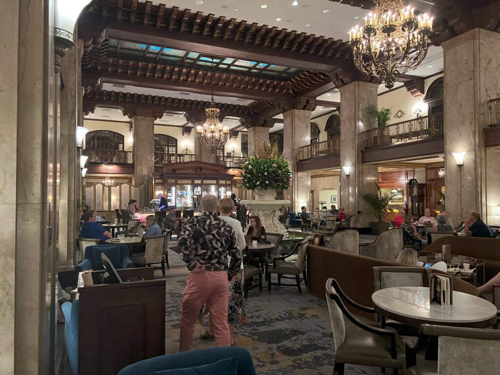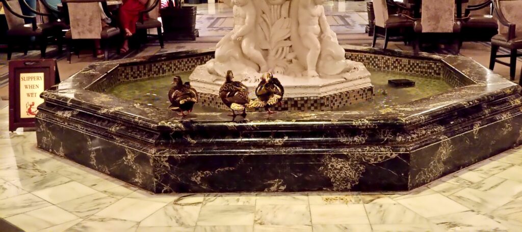 The hotel has a rather strange daily tradition. On the rooftop of the hotel lives a small family of ducks. At 11am the ducks come down in the lift to the ground floor, where they march along a red carpet to the fountain in the centre of the hotel reception. They splash around in the fountain until 5pm, when they make the return journey back to the roof. The march is a piece of theatre that attracts the crowds, and presumably brings in punters to the hotel – especially the ones with kids.