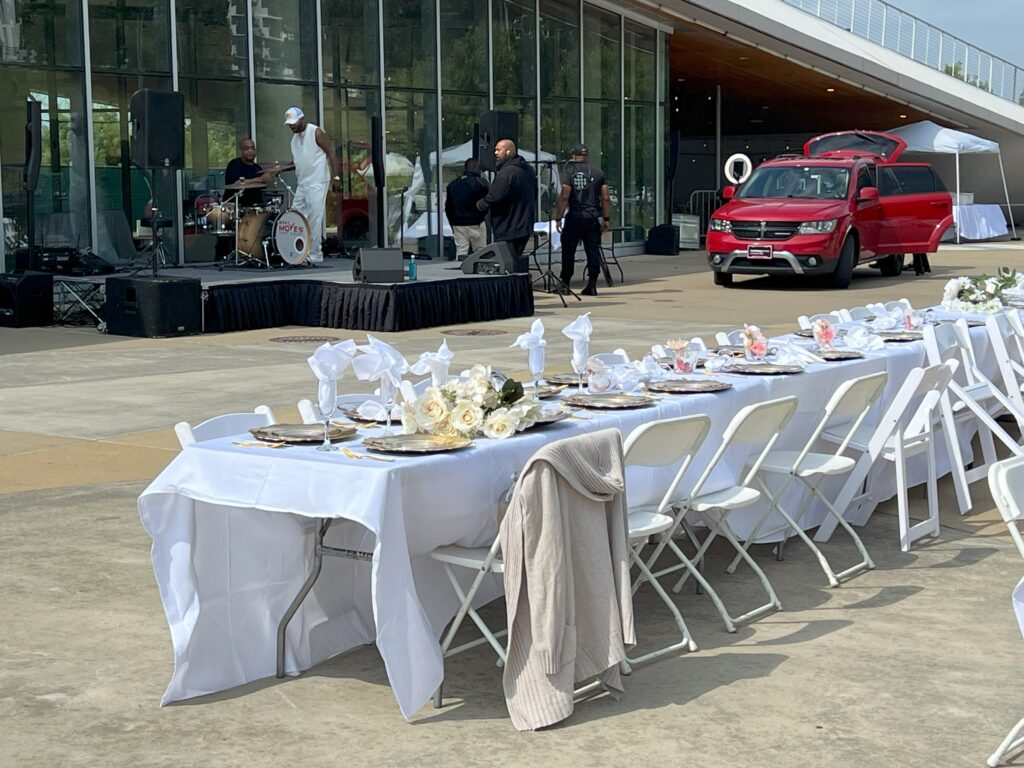 For the rest of the walk I’m minding my own business. That is until I come across the ‘white party’ preparations. Actually, that’s ‘white’ as in ‘black’. A nice lady preparing a table explains it to me: ‘White’ parties are held in major cities across America – Chicago, Detroit, Austin,………and tonight, in Memphis. They have become a fixture in black culture as a celebration of beauty and community. Everything about the party is white – the table coverings, the serviettes, the chairs, and the people – the dress code that is – strictly white. White represents purity, cleanliness, unity, and harmony. Sounds like a good party.